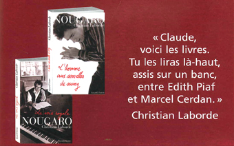 Hélas publiés après sa disparition mais « lus et approuvés » par lartiste , sont parus ensuite (au début du printemps 2004) deux « Nougaro », deux biographies originales signées Christian Laborde : lune, imaginaire, pleine daction, dhumour et de musiques, LHomme aux semelles de swing ; lautre, aussi réaliste que profondément littéraire, La Voix royale (qui sachève avec la préparation du dernier opus, encore à paraître) ; les deux ouvrages se complétant et formant une "Balade en Nougarie" imaginée avec le Grand Claude. Deux livres au format poche (150 et 184 pages respectivement), disponibles séparément ou réunis dans un étui au motif dessiné spécialement par Claude Nougaro.