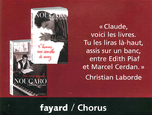 Après le livre-album Brel, Brassens, Ferré : trois hommes dans un salon et Il était une fois la chanson française, des origines à nos jours, de Marc Robine, deux ouvrages désormais incontournables pour tout amateur de chanson qui se respecte, le "Département chanson Chorus-Fayard" a édité simultanément deux nouveaux livres consacrés à Claude Nougaro : La Voix royale et L'Homme aux semelles de swing, de Christian Laborde.